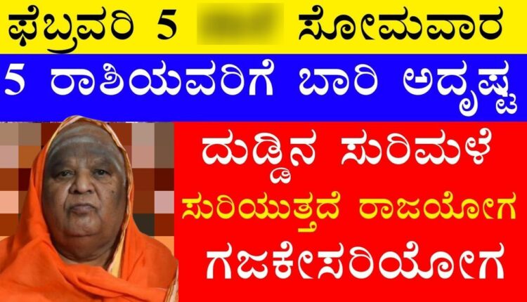 ಫೆಬ್ರವರಿ 5 ಸೋಮವಾರ 5 ರಾಶಿಯವರಿಗೆ ಬಾರಿ ಅದೃಷ್ಟ ದುಡ್ಡಿನ ಸುರಿಮಳೆ ಸುರಿಯುತ್ತದೆ ರಾಜಯೋಗ ಗಜಕೇಸರಿಯೋಗ