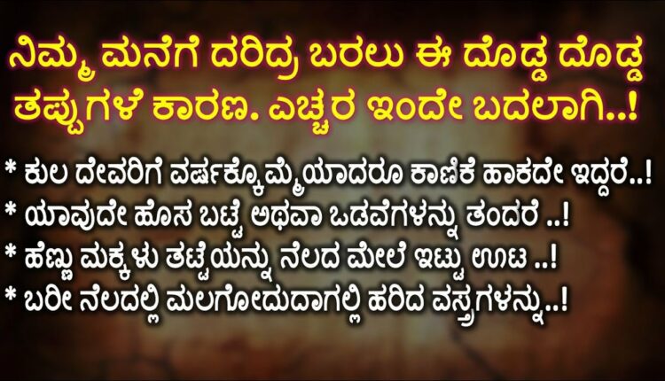 ನಮ್ಮ ಮನೆಗೆ ದರಿದ್ರ ಬರಲು ನಾವು ತಿಳಿಯದೆ ತಿಳಿದು ಮಾಡುವಂತಹ ಕೆಲವೊಂದಿಷ್ಟು ತಪ್ಪುಗಳಿಂದ ನಮ್ಮ ಮನೆಗೆ ದರಿದ್ರ ಬರುತ್ತದೆ. ಇಂತಹ ತಪ್ಪುಗಳನ್ನು ನಾವು ಸರಿ ಮಾಡಿಕೊಂಡರೆ ನಾವು ಆರ್ಥಿಕವಾಗಿ ಆರೋಗ್ಯವಾಗಿ ಎಲ್ಲಾ ಕೆಟ್ಟ ಶಕ್ತಿಯಿಂದ ಕೂಡಿ ಮುಕ್ತಿಯನ್ನು ಹೊಂದಬಹುದು. ಇನ್ನು ಯಾವೆಲ್ಲಾ ತಪ್ಪುಗಳನ್ನು ನಾವು ಸರಿ ಮಾಡಿಕೊಳ್ಳಬೇಕು ಅಂತ ನೋಡುವುದಾದರೆ