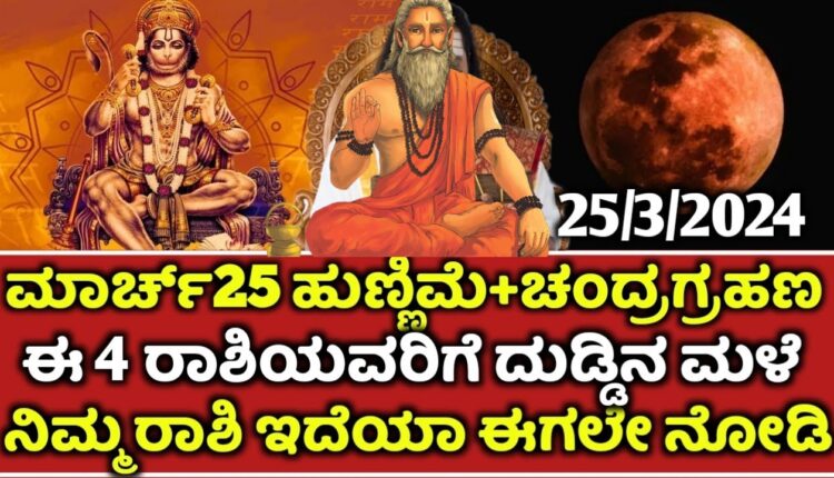ಮಾರ್ಚ್ ಇಪ್ಪತ್ತೈದನೇ ತಾರೀಖು ಬಹಳ ಭಯಂಕರವಾದಂತಹ ಹೋಳಿ ಹುಣ್ಣಿಮೆ ಮತ್ತು ಚಂದ್ರ ಗ್ರಹಣ ಸಂಭವಿಸಲಿದೆ. ಈ ಚಂದ್ರಗ್ರಹಣದ ಒಂದು ಈ ನಾಲ್ಕು ರಾಶಿಯವರಿಗೆ ದುಡ್ಡಿನ ಸುರಿಮಳೆ ಸುರಿಯುತ್ತದೆ. ಆಂಜನೇಯ ಸ್ವಾಮಿಯ ಕೃಪೆ ಇವರ ಜೀವನವನ್ನೇ ಬದಲಾಯಿಸುತ್ತದೆ.ಹಾಗಾದರೆ ಅಂತಹ ಅದೃಷ್ಟವಂತ ರಾಶಿಗಳು ಯಾವುದು ಹಾಗೆ ಅವುಗಳಿಗೆ ಯಾವೆಲ್ಲ ಲಾಭ ಸಿಗಲಿದೆ ಅಂತ ನೋಡೋಣ ಬನ್ನಿ.