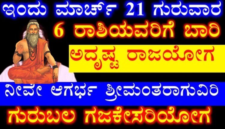 ಇಂದು ಮಾರ್ಚ್ 21 ಗುರುವಾರ 6 ರಾಶಿಯವರಿಗೆ ಬಾರಿ ಅದೃಷ್ಟ ರಾಜಯೋಗ ನೀವೇ ಆಗರ್ಭ ಶ್ರೀಮಂತರಾಗುವಿರಿ ಗುರುಬಲ
